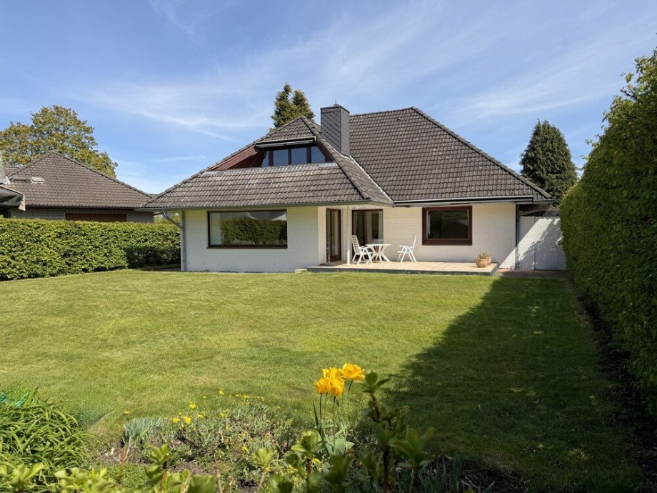 Das 716 m² große, nach Süd-Westen ausgerichtete Grundstück verfügt zur Straße über einen großzügigen Vorgarten. Der rückwärtige Grundstücksteil ist geprägt durch Rasenflächen und einen teilüberdachten Terrassenbereich. Hier lässt es sich wunderbar erholen, spielen oder mit Freunden verweilen.
